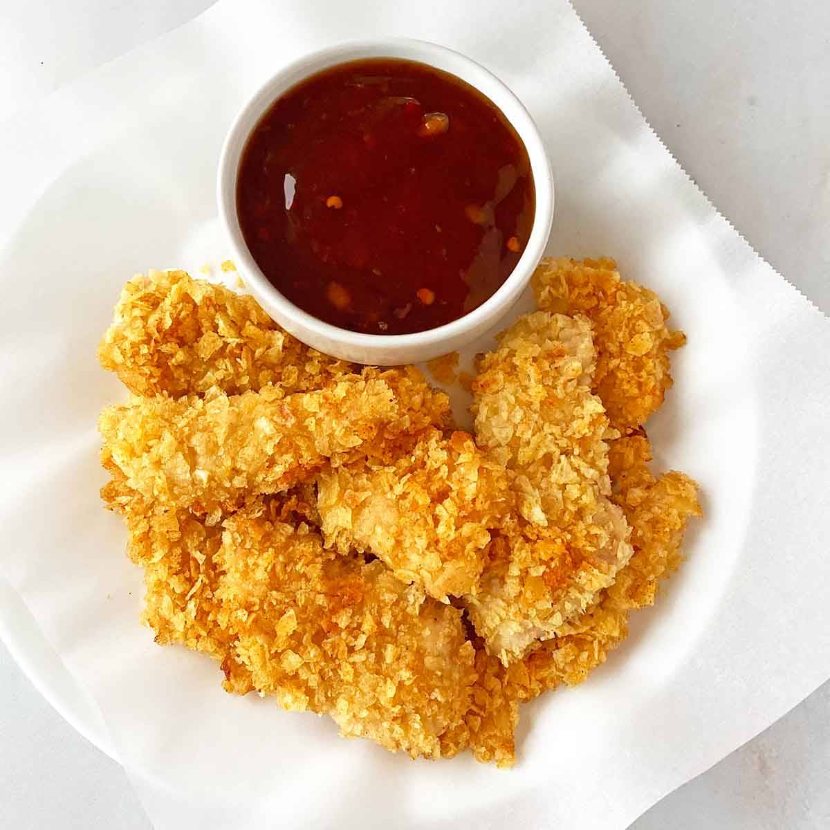 Tender chicken breasts are coated in crushed potato chips and baked to golden perfectionβno frying needed. These homemade chicken tenders are a hit with kids and grown-ups alike, and they make an easy appetizer, too.